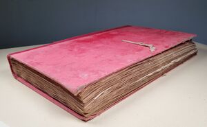 - Description: An approximately 153-page red cloth-bound book containing pasted in minutes of meetings. Each page contains one or more pages relating to one meeting (usually one or two pages of minutes and one page of financials). The odd pages were photographed first, followed by the even ones. Many pages are of thin paper, so a card insert was used to reduce bleed-through and improve legibility.