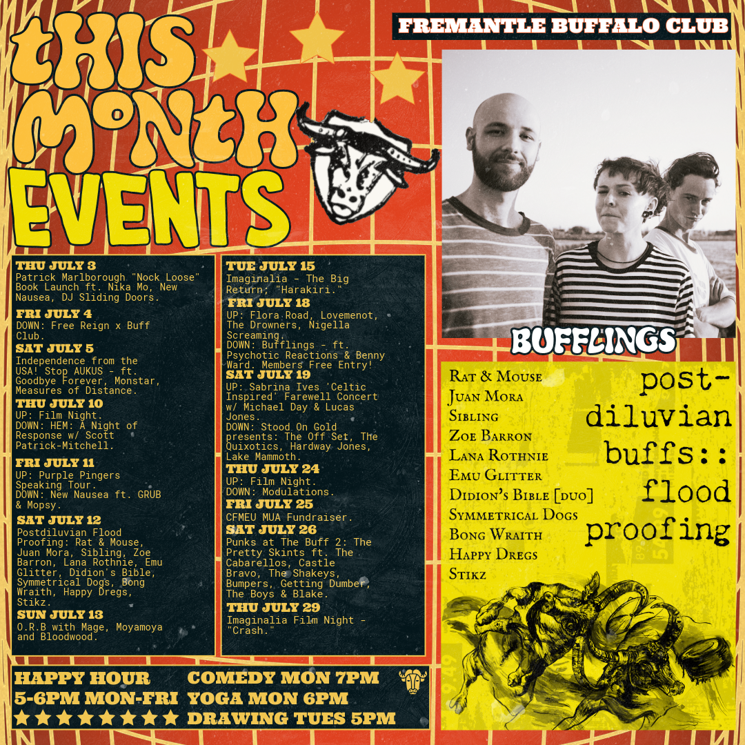 June was anything but sleepy. We kicked off with the thundering one-two punch of Didion’s Bible’s album launch and Clubb Medd, a double-header that shook the foundations upstairs and out the door. Sub-bass and syncopation met jangle-pop joy, proving once again that no building in Freo grooves like the Buff.
