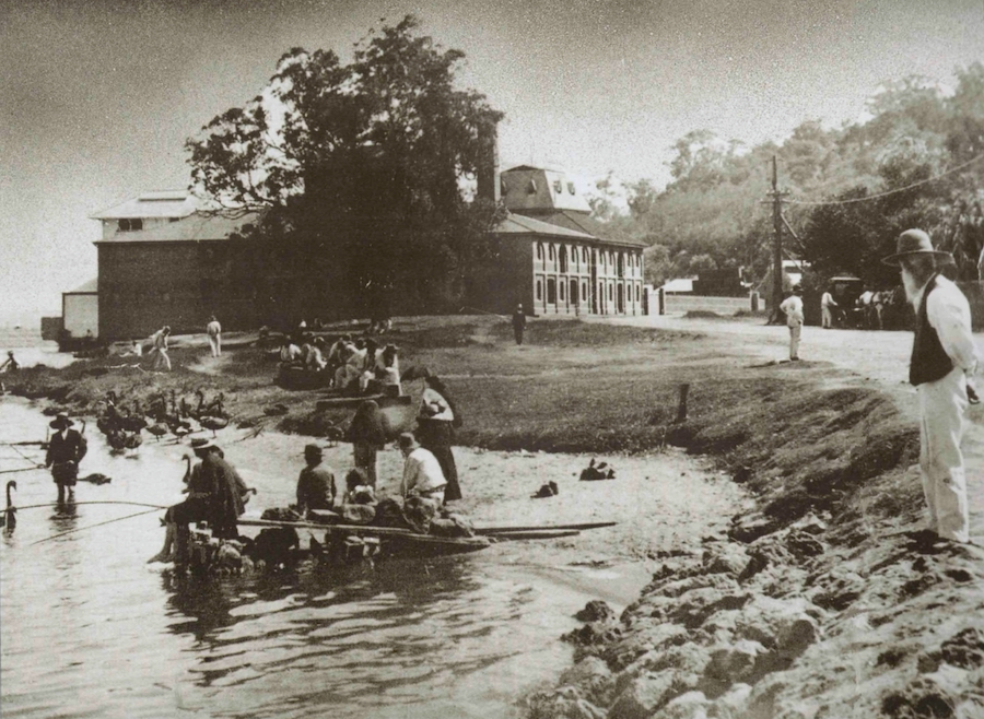 The man on the right probably lives in the Old Men's Home which was established in the former [[../places/mtelizadepot.html|convict hiring depot under Mt Eliza]], and was in existence 1872-1906, until the men were moved to a new home in Claremont (now Sunset Hospital, Dalkeith). Photo from the archives of WA Newspapers, n.d., from Austen. Mounts Bay Road passes in front of the Swan Brewery, as it still does in 2021.