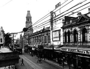 The facade of the King's Theatre can still be seen at the junction of Market and South streets, adjacent to the Newport Hotel. Almost opposite, the old Palladium Theatre once stood, on the corner of Bannister Street, while around the corner in High Street, the facade and balconies of the old Majestic Theatre are still evident. The Olympia Picture Palace [see below], also in High Street in 1914, has disappeared.