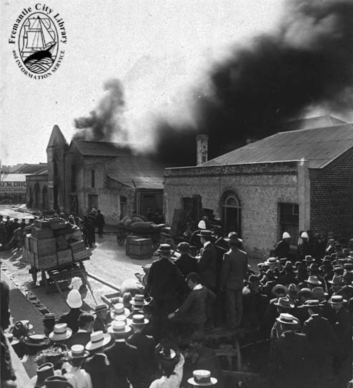 Fremantle Library photo ref. no. 715, showing the 1901 fire. 'A crowd watching a fire at the Eureka Flour Mill in Nairn Street near Pakenham Street. A dray is loaded with crates and another with sacks. J.M. Drummond's store can be seen in the background' [in Pakenham Street].