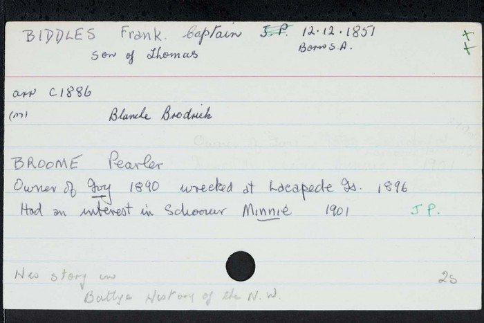 Captain Frank Biddles (1851-1932) was a pearler from Broome, Western Australia. As captain of the Alto in 1901, he was involved in rescuing 121 people following the wrecking of the SS Karrakatta in King Sound. He retired to Fremantle in 1902 (aged 51), and became a developer. In 1909 he married Blanche Isobel Brodrick (youngest daughter of G. W. Brodrick, a solicitor from New Zealand). They would go on to have two sons and a daughter.