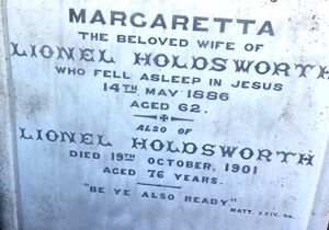 Margaretta and Lionel's 1886/1901 gravestone was brought from the Skinner Street cemetery and may be seen on the Heritage Trail in Fremantle Cemetery, at (my number) #46. Lionel Holdsworth's remains would have been interred in the older cemetery for the special reason that he could lie with his wife, as that cemetery had closed in 1898 except for cases like this.