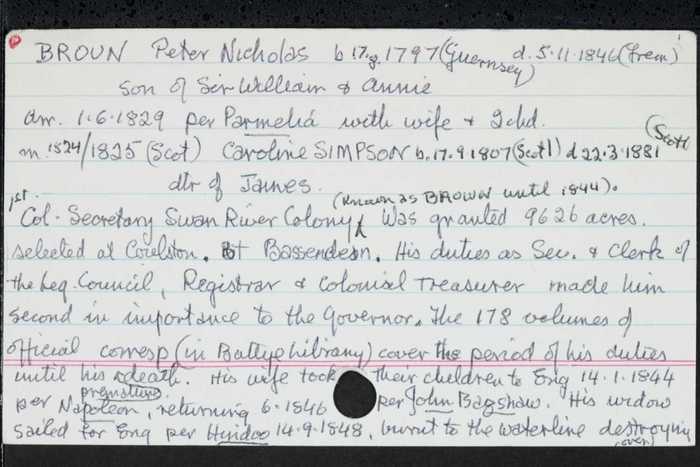 BROUN, Peter Nicholas, b. 17.8.1797 (Guernsey), d. 5.11.1846 (Frem), son of Sir William & Annie, arr. 1.6.1829 per Parmelia with wife & 2 chd. m. 1824/5 (Scotland) Caroline SIMPSON b. 17.9.1807 (Scotland) d. 22.3.1881 (Scotland) dtr. of James. Chd. McBryde Anderson b. 1826 d. 1866, Ann M. b. 1828 d. 1912, Ellen Stirling b. 1829 d. 1875 (Frem) James William b. 1831 d. 1897, Son b. & d. 1833, Mary Susan L. b. 1835, John Carey & Caroline Henrietta b. & d. 1836, Charles Frederick b. 1839, Matilda Caroline Maud b. 1840, Jessie Souper b. 1842 d. 1873. 1st Col. Secretary Swan River Colony (known as Brown until 1844). Was granted 9626 acres selected at "Coulston". Bt. "Bassendean". His duties as Sec. & Clerk of the Leg. Council, Registrar & Colonial Treasurer made him second in importance to the Governor. The 178 volumes of official correspondence (in Battye Library) cover the period of his duties until his premature death. His wife took their chd. to England 14.1.1844 per Napoleon returning 6.1846 per John Bagshaw. His widow sailed for England 14.9.1848 per Hindoo burnt to the waterline