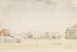 Lieutenant [[../people/dashwoodgeorge.html|George Dashwood]] from the Challenger has left us two well-known sketches of streetscapes of built-up Pakenham Street. One shows the Stirling Arms Hotel and part of Harbourmaster [[../people/scott.html|Scott]]’s house, the other the cottage-store built by James Solomon, later used by John Weavell. ...
