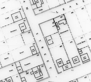 The image at right is part of an 1844 map redrawn by R.McK. Campbell. It is intended, in this context, to show the relationship between Leake Street and the site of the Stirling Arms (on the corner where 'Thompson' is thus misspelt) and the site of Scott's property two lots away.