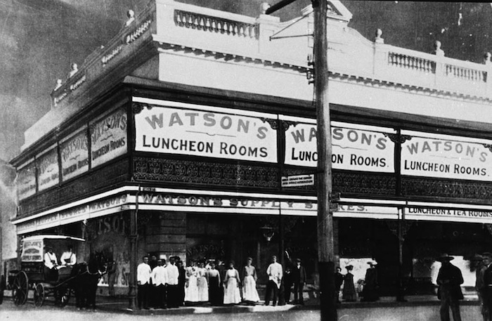 Watson's Luncheon Rooms, photo 1910 #2696. This building was erected in 1903 as part of the Owston Buildings. It was purchased by the Waterside Workers' Federation in 1955, when Watson's built their administration block at Spearwood. Watson's Luncheon or Refreshment Rooms operated from the site 1907 to 1914 and then it became Watson's Supply Stores.
